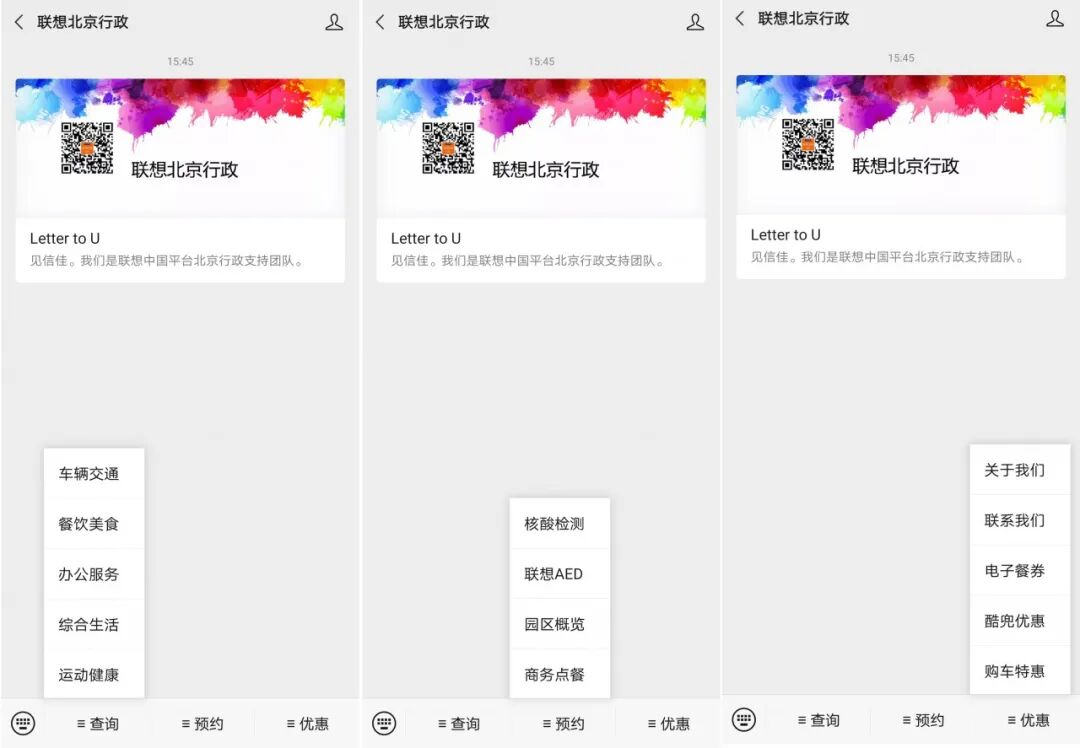菜单栏是员工使用率最高的功能。因此可以在这里设置上基础行政服务内容。这里可以参考联想北京行政的菜单设置,每个菜单栏几乎设置到了极限,内容涵盖了员工服务的方方面面。员工在菜单栏内容能够直接找到固定内容,实用性超强。