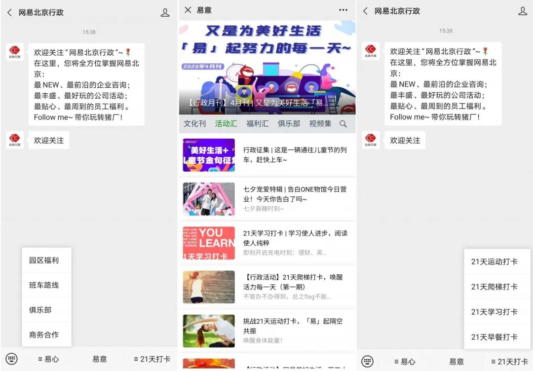 比如网易北京把自己的21天系列活动组成一个菜单,21天运动打卡、学习打卡、早餐打卡...不仅通过菜单增加和员工的互动,还从员工精神面貌角度宣传了企业文化,玩出了自己的特色。