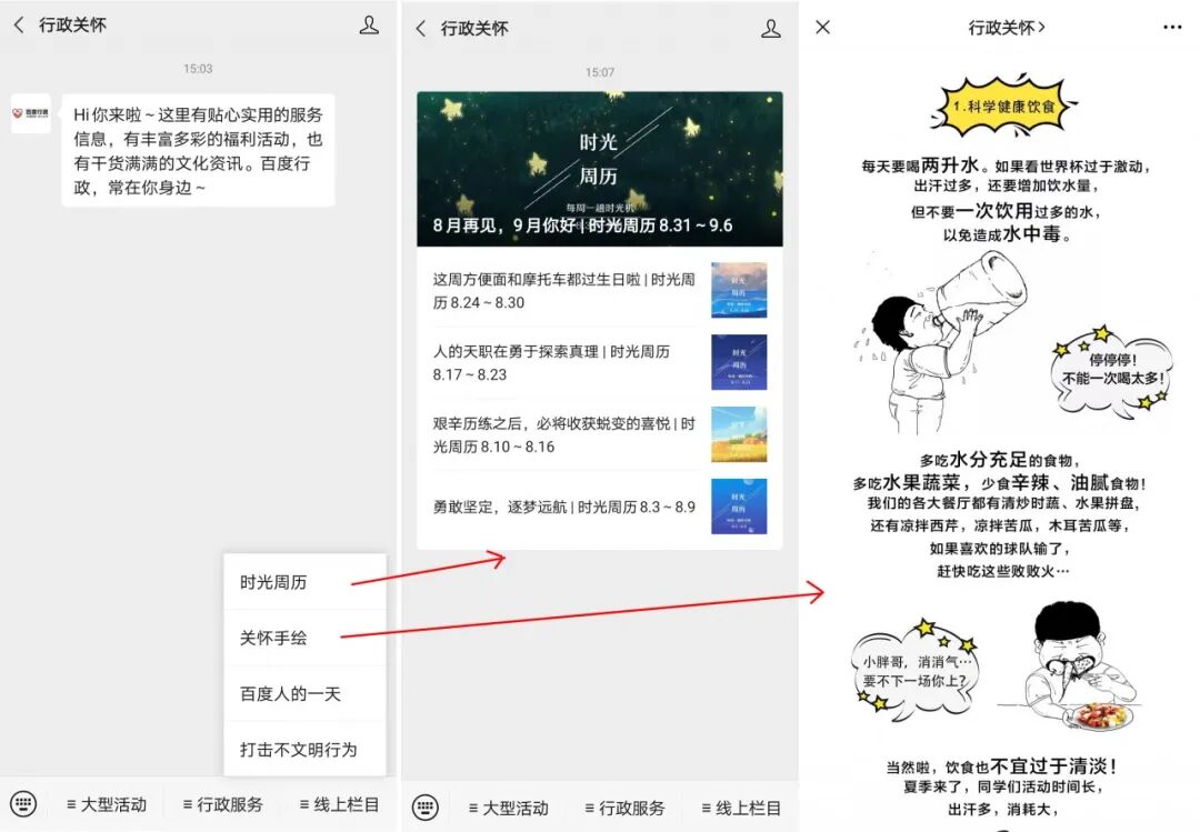 百度行政结合自己的内容形式打造了线上栏目菜单,时光周历是汇总历史上这一周内发生的大事件;关怀手绘把行政对员工的关怀以趣味漫画形式展现,连普通的「多喝水」也变得超有趣。
