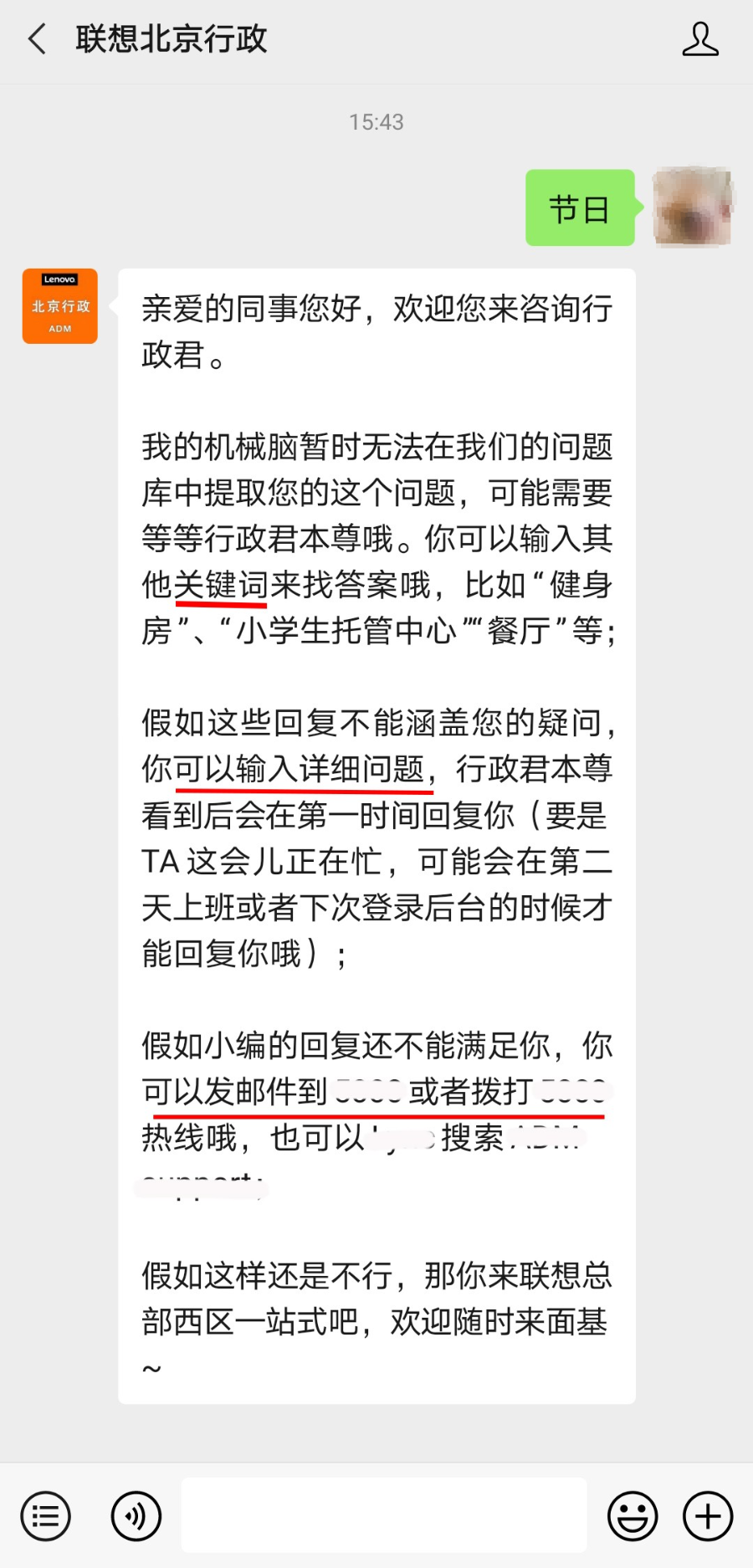 联想北京行政平台还在「收到消息回复」的功能中增加了功能指引,用十分全面的回复,引导员工使用关键词等功能查询问题。
