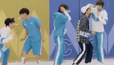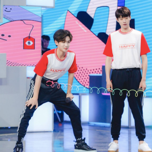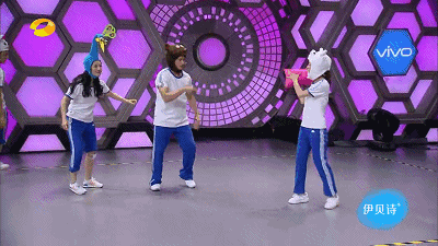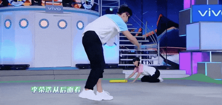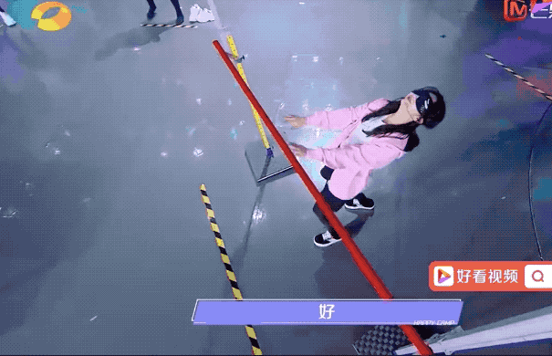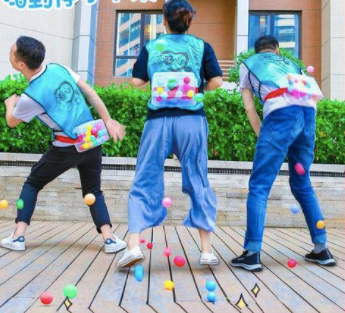 ②、指压板顶气球:在队友的指挥下站在指压板上向上跳,用头上的道具把头顶悬挂的气球戳破,然后成功与下一个环节的队友击掌完成接力。