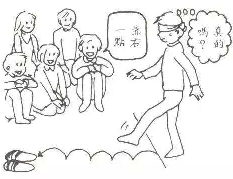 游戏规则:把拖鞋放在起点前方5步左右的地方,各队轮流派出1人在起点蒙眼旋转三次以后出发,能够准确前进5步、在第6步成功穿到拖鞋教多的一组获胜。进行中竞争对可以进行语言干扰。
