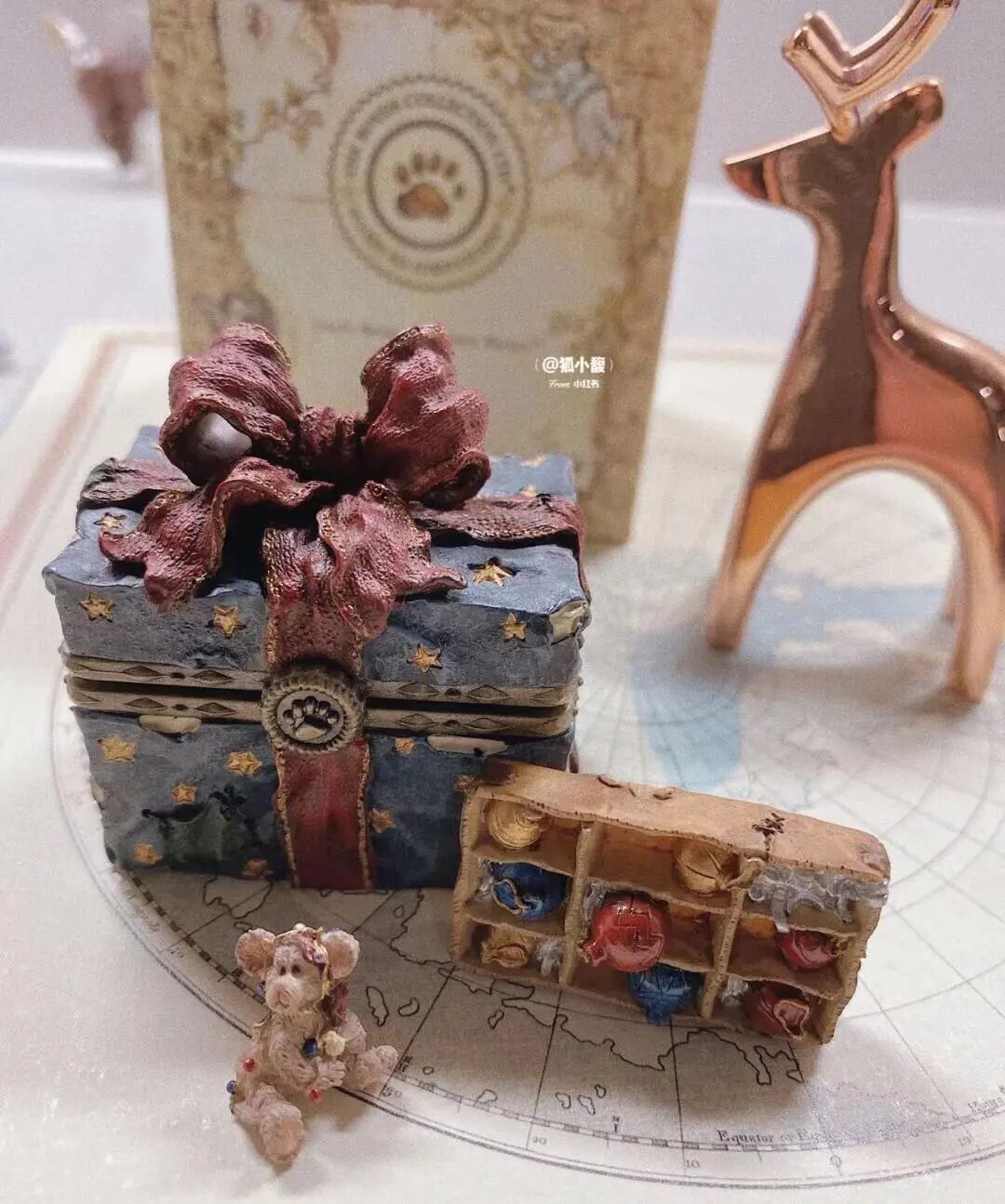 这是一个装了圣诞礼物的宝箱,里面藏了只小老鼠,旁边散落着装饰球,好像住进了童话世界。盒子里面可以任意搭配圣诞元素的小摆件哦~
