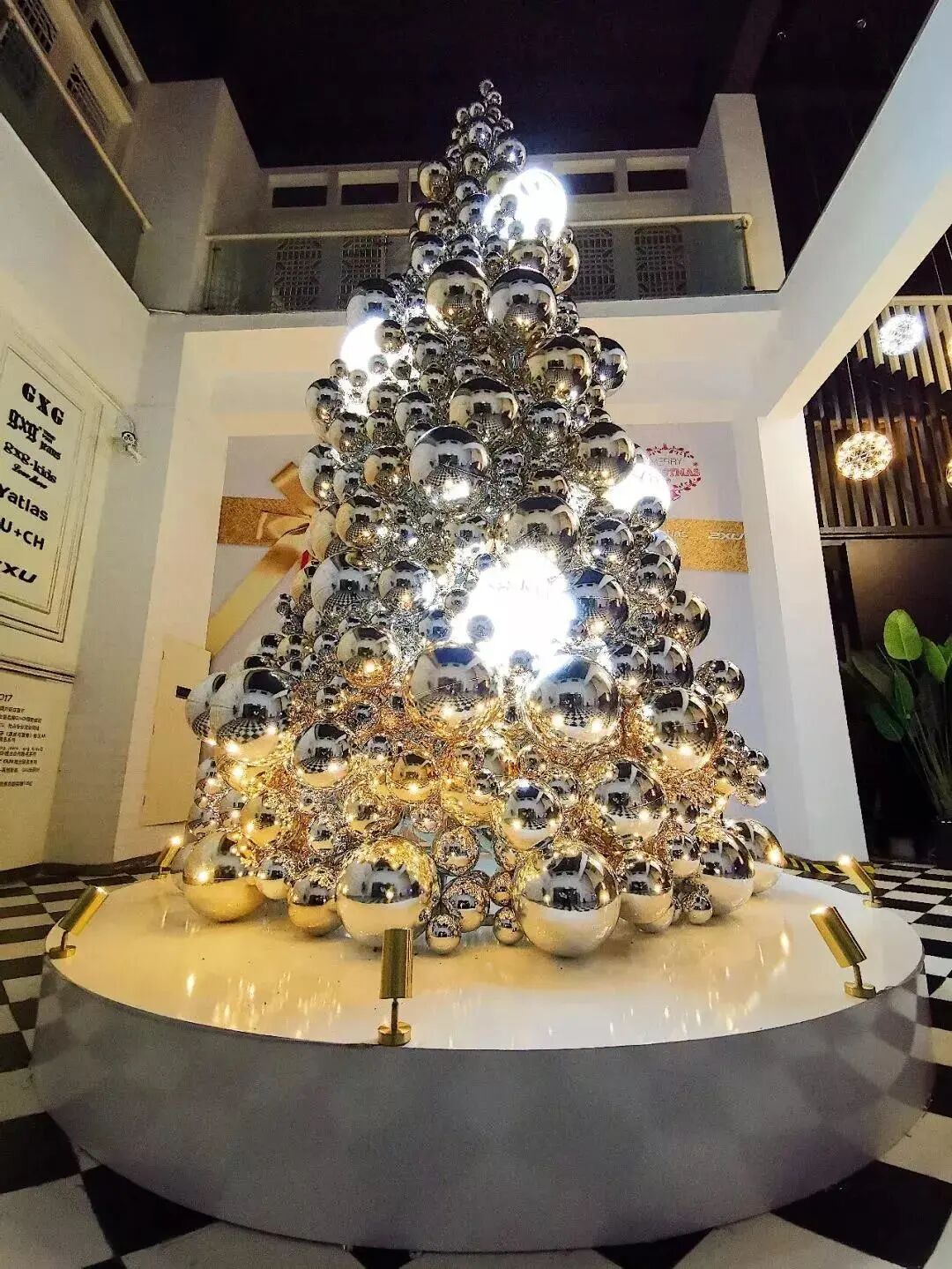 GXG用银色球球做的圣诞树,闪闪的太容易俘获女员工的心了,灯一开,气场立刻就出来了。