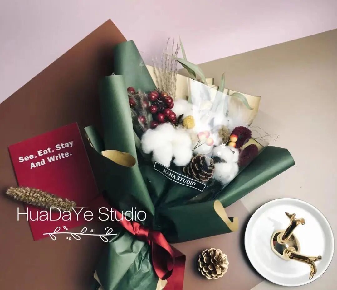 圣诞一定要用棉花、松果、红果果这些有圣诞元素的花材,做一款圣诞专属花束来拯救不开心。
