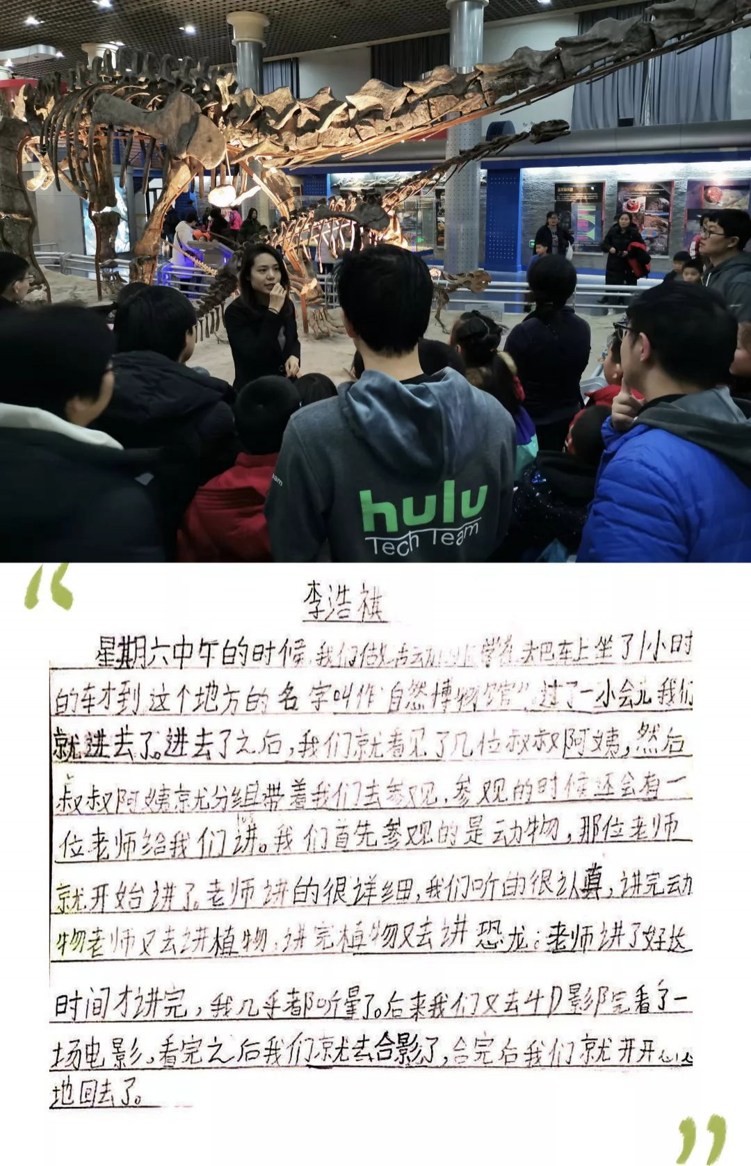 HULU长期帮助和支持燕京小天鹅公益学校,在带小朋友们体验“从零到一玩编程”的科技启蒙课堂快乐后,又陪伴小朋友们一起参观了自然博物馆,穿梭在古生物化石、动物模型和植物标本之间,被科普了丰富的生物、自然历史知识,这样的经历被小朋友们写成了一篇篇有趣的游记。
