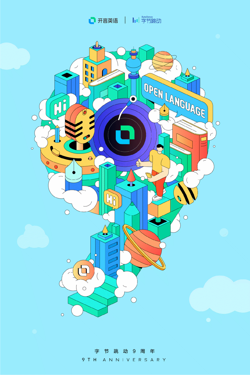 海报整体是一个数字「9」的形状,内容上分别结合了公司旗下的不同产品比如今日头条、抖音等,制作出9张创意海报