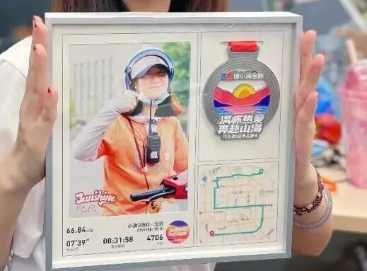 纪念章,连同该同学的跑步照片和跑步路线一同装裱