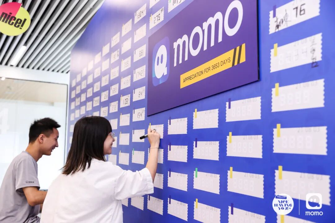 签到区的时间背板上,陌陌er们记录下自己入职的时间。当整面墙被不同时间填满时,好像能看到陌陌这十年不断发展壮大的过程,场面很壮观!