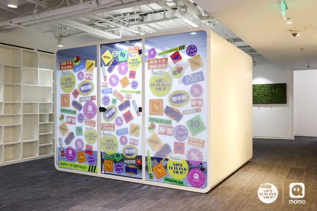前台、电话亭和办公区也都被装饰起来,走进陌陌,小知就被司庆氛围迅速环绕。