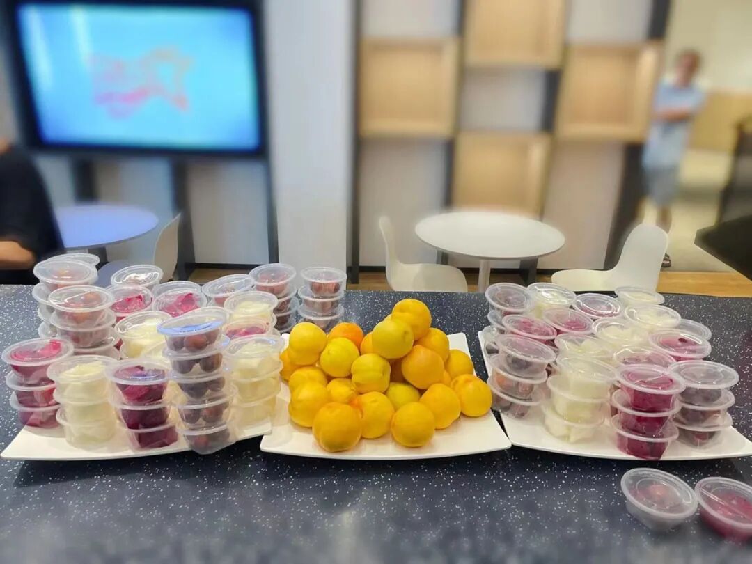 除了零食,每天下午都会供应鲜切水果下午茶,冰箱里还备有牛奶和冰块供员工使用。