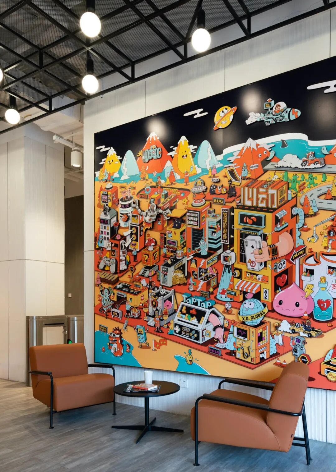 这面墙则是心动将自研游戏和产品的元素进行抽象和组合,所描绘出一座充满快乐的“心动小镇”。