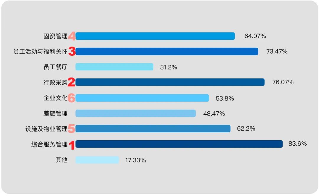 在行政人员的日常工作中,综合服务管理、行政采购、员工活动与福利关怀排名前三;而固资管理、设施及物业管理、企业文化虽然排名4/5/6,但所占比重超过半数,不容小觑。可以看出行政工作已经不仅仅是传统的综合服务管理那么简单,新行政的工作正在朝着采购、企业文化等垂直方面深入发展。