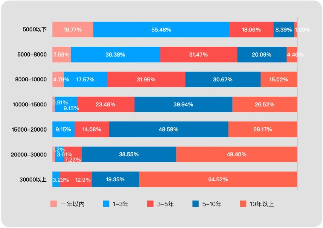 在以往职场人的眼中,行政属于底薪人群。那么真实情况如何?5k以下月薪的行政人群占比10.33%,8k以下占比超过40%。不过8k-10k、10k-15k的占比比较可观,均超过20%。20k以上月薪的行政仅占7.6%。(*本次参与调研的一线及新一线城市行政占比超70%,整体薪资数据对一线及新一线城市人群更具参考性)在从业3年以内的行政人员中,月薪8k以下占比超过60%;超过半数的从业10年以上的行政,月薪可达到30k以上。且随着工作年限的增加,行政的月薪水平也随之提高。