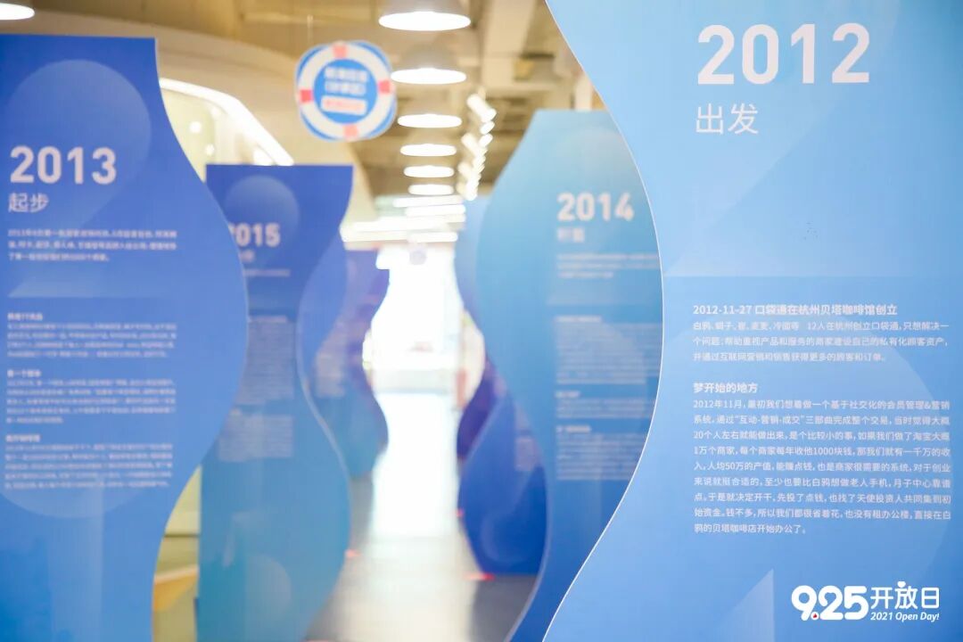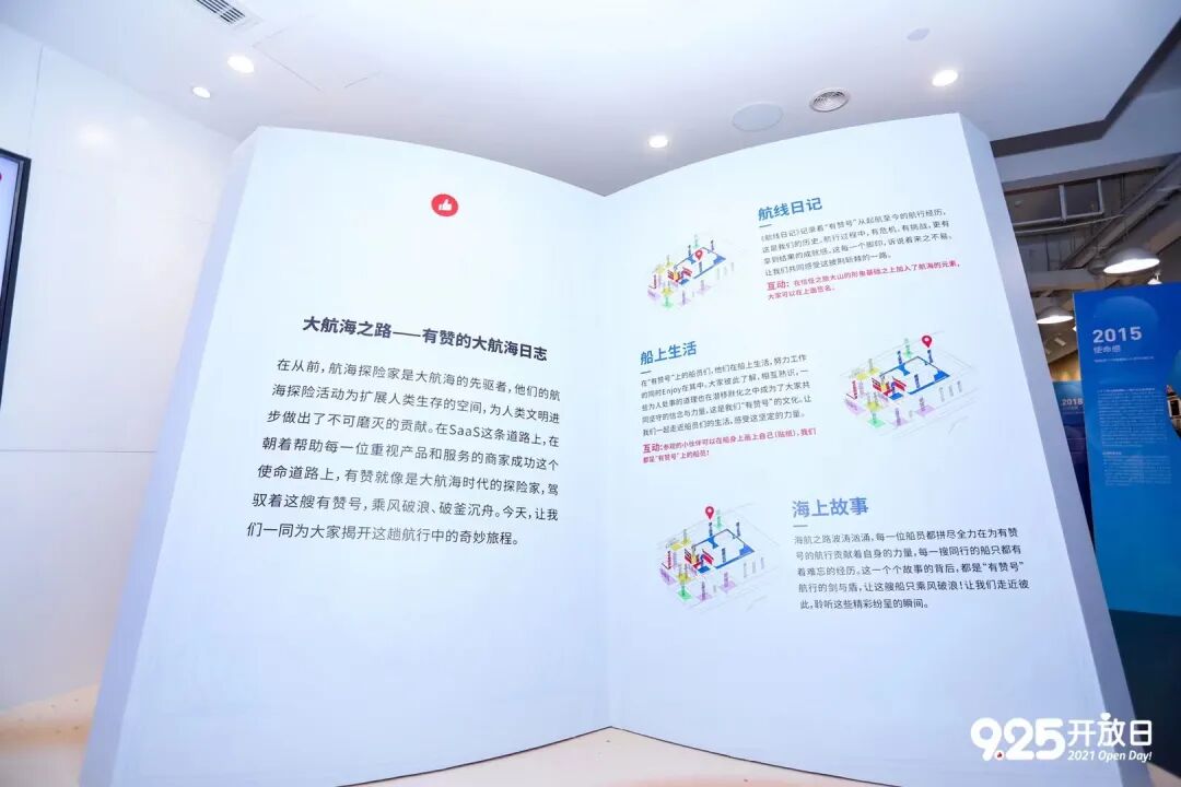 通道里,海浪造型的时间背板记录下有赞的航海探险经历;在海上生活版面,他们通过真实故事讲述有赞er的探险生活,记录从2012年到2021年不同阶段的观念变化。实现企业发展历程和文化的落地。值得一提的是现场还贴心地安排了参观班车和专业解说员,为参与者讲述有赞一路走来的故事。