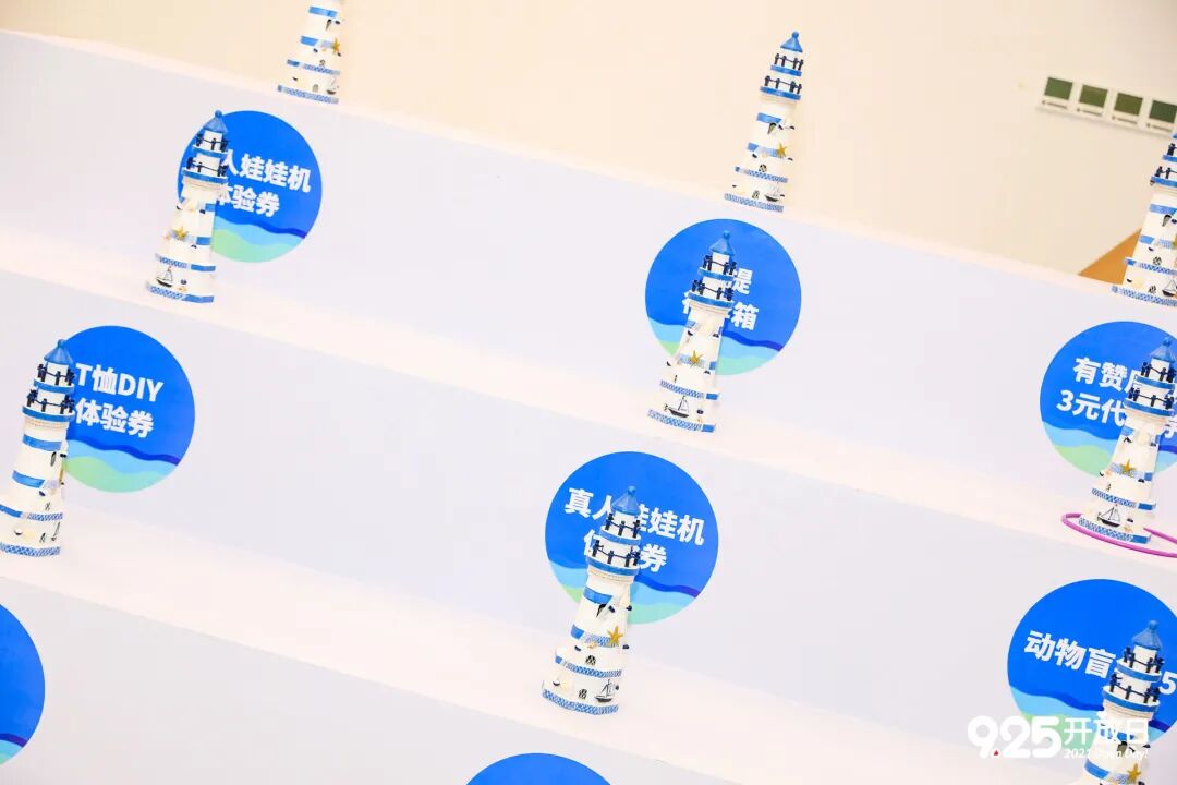走进活动现场,整体环境装饰以蓝色为基调,凸显航海主题。灯塔、冰山、渔网、船锚、海浪等元素的加入,展现出只有在航行中才能见到的景象,让整个空间充满沉浸感。