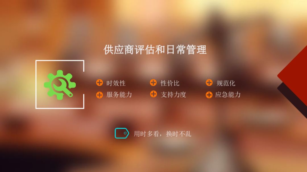 其次,要充分认识打造优秀而忠诚的供应商对企业发展的重要性,以战略合作的高度对供应商进行选择、评价和管理,对供应商管理与帮助并行,譬如为供应商提供培训、交流的机会,甚至个人职业发展、公司业务发展的机会,激励供应商成长,这不仅仅粘合了与供应商的关系,同时这些培训和交流的成果也会反哺到合作中来,实现双方共赢。