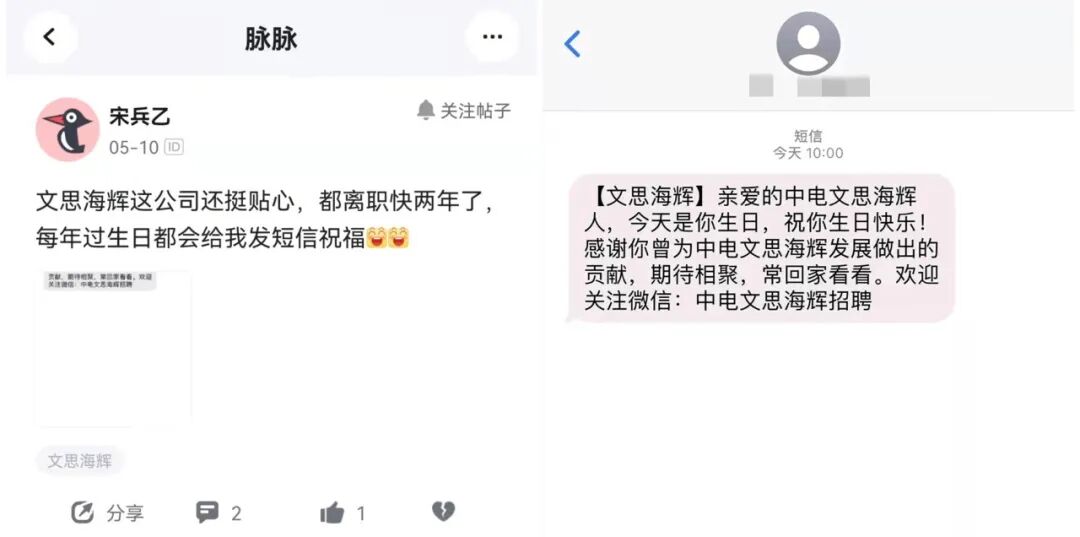 文思海辉 会在离职员工的生日当天发送祝福短信,并附上招聘渠道,欢迎离职员工回流。