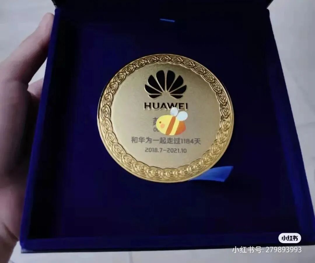华为为员工特别定制了纪念章,并刻有名字和在职时间,这也象征了企业对员工所作出贡献的一种肯定。