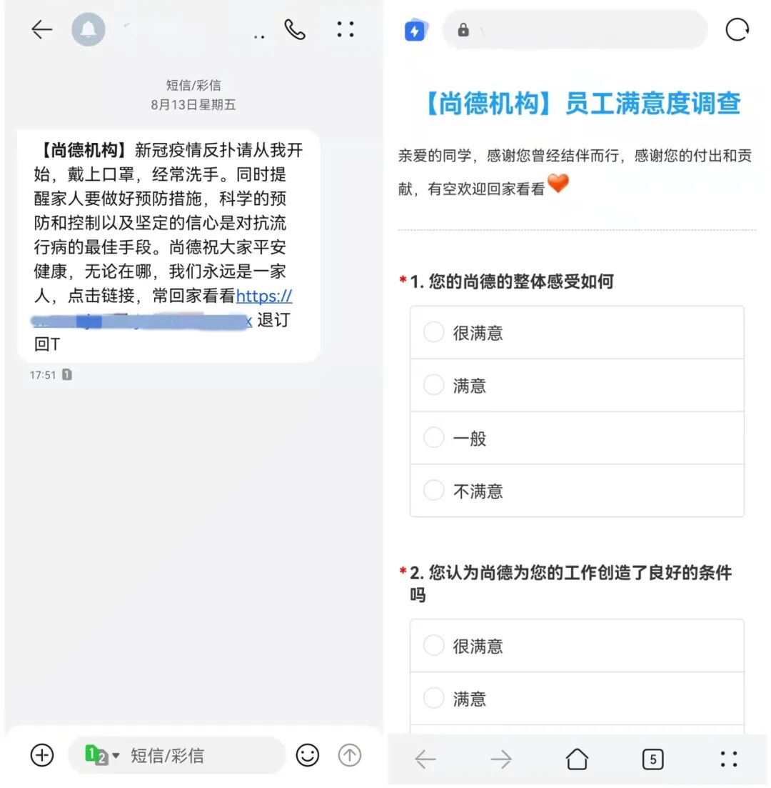 尚德机构在提醒离职员工注意疫情防护的同时,还附上了“员工满意度调查问卷”,听取离职员工对公司的看法。