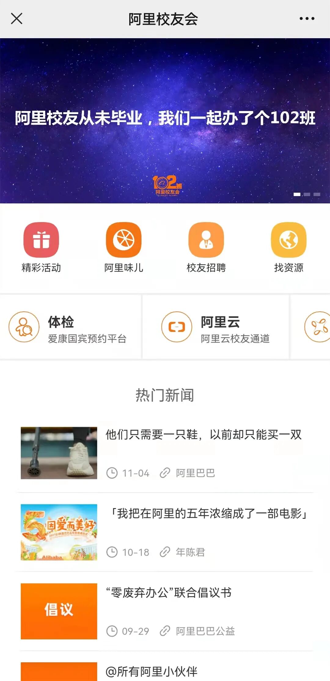 在阿里校友会官网内,除了企业动态、日常活动回顾和招聘外,还特别为离职员工提供校友通讯录、本人及家人的体检、阿里云相关功能免费试用等服务,关怀十足。