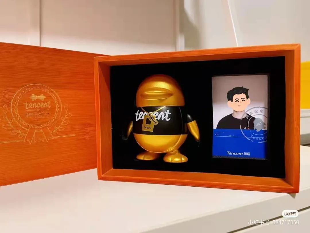 腾讯的毕业礼物是一个金色的企鹅手办,以及一张带有银色印章的纪念版工卡,为员工创造归属感。