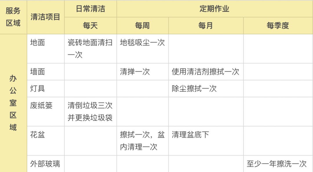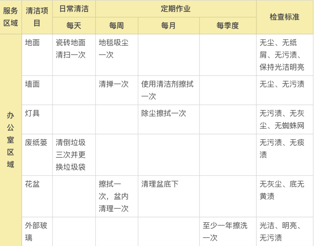 办公区域及走廊是人员活动的高频区域,相应的保洁频次也要增加,每天至少两次保洁是必要的;