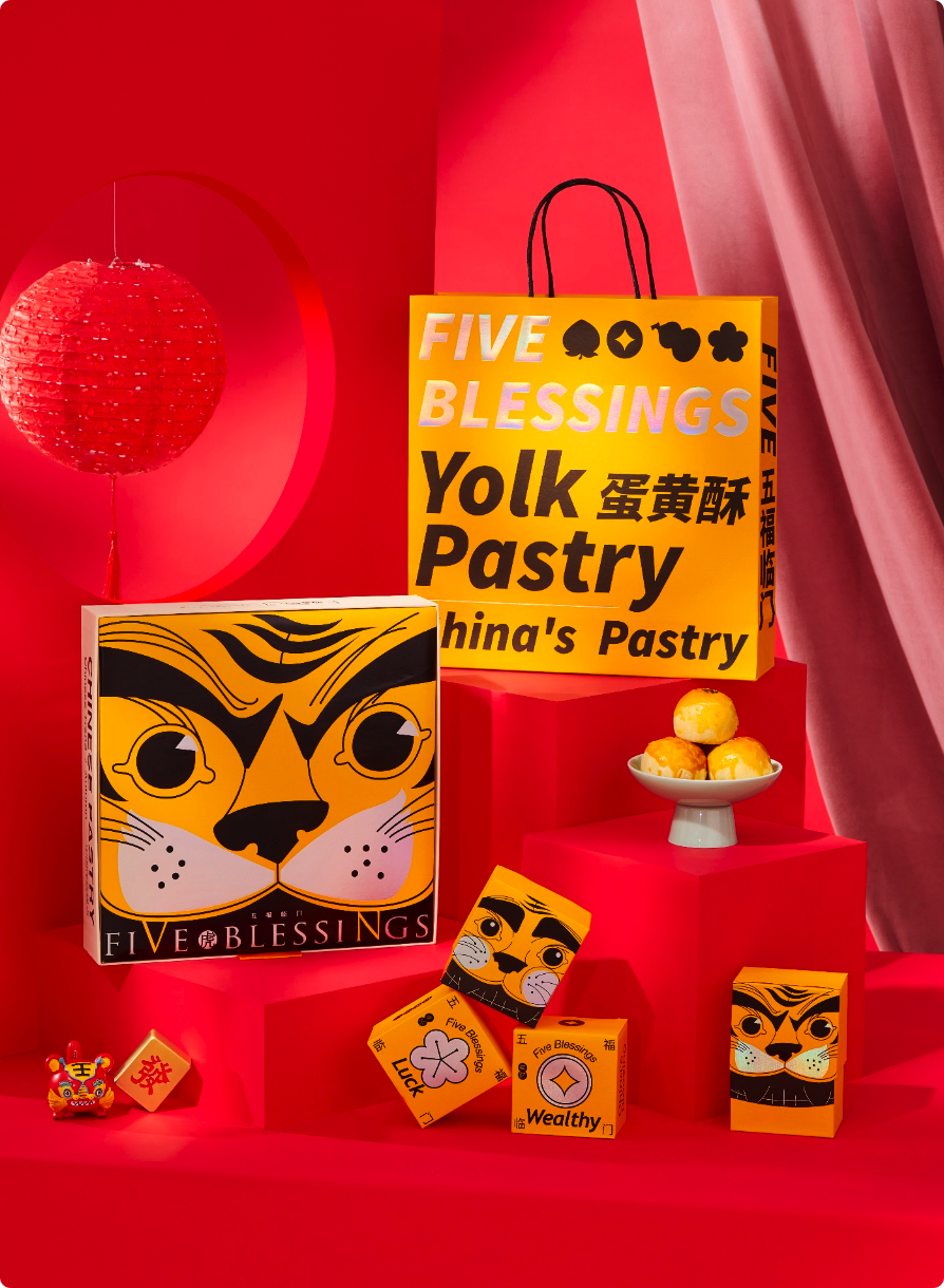 蛋黄酥可谓是近几年节日送礼食品界的c位担当,春节送礼一家人团聚分享最合适不过!而且这款礼盒里每个小卡盒都有小机关,抽出即现5只不同造型的小老虎窗花,喜气洋洋。