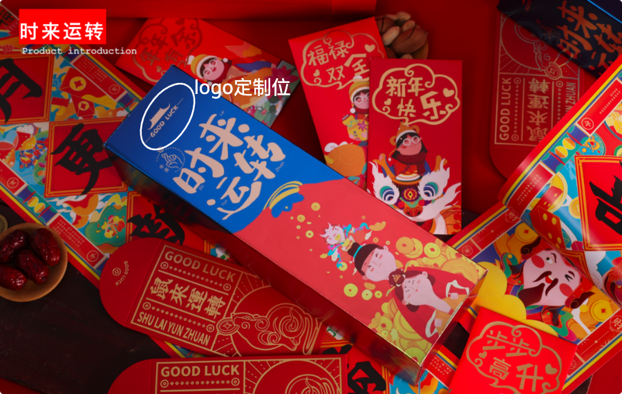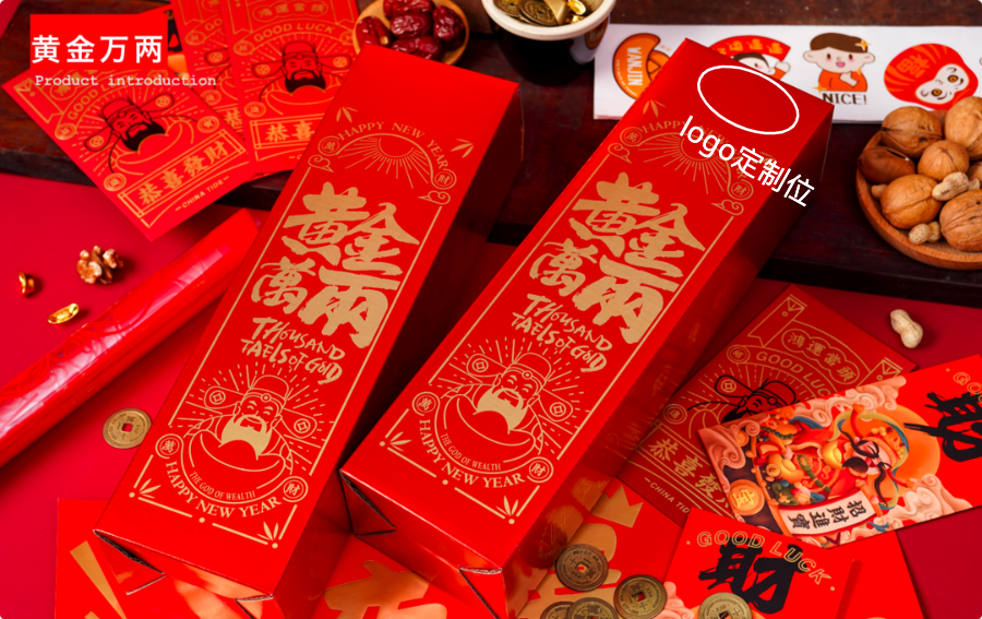 黄金万两/时来运转礼盒,内含春联、红包、窗花等物品,两种不同包装造型,年味十足。