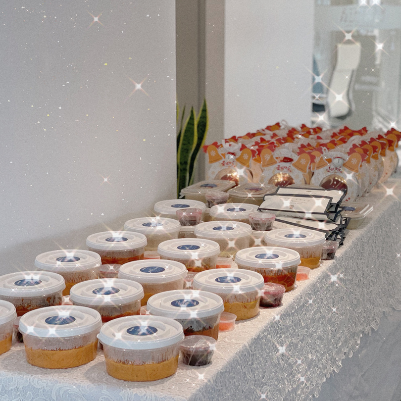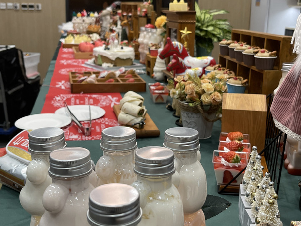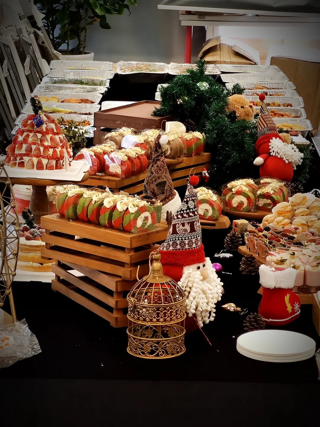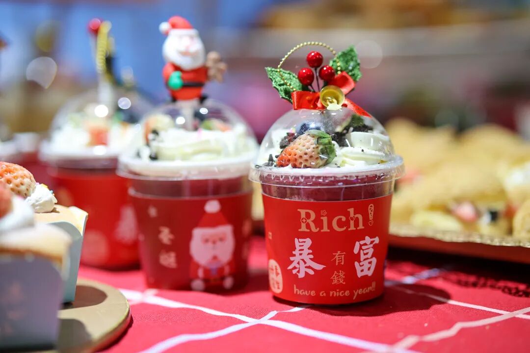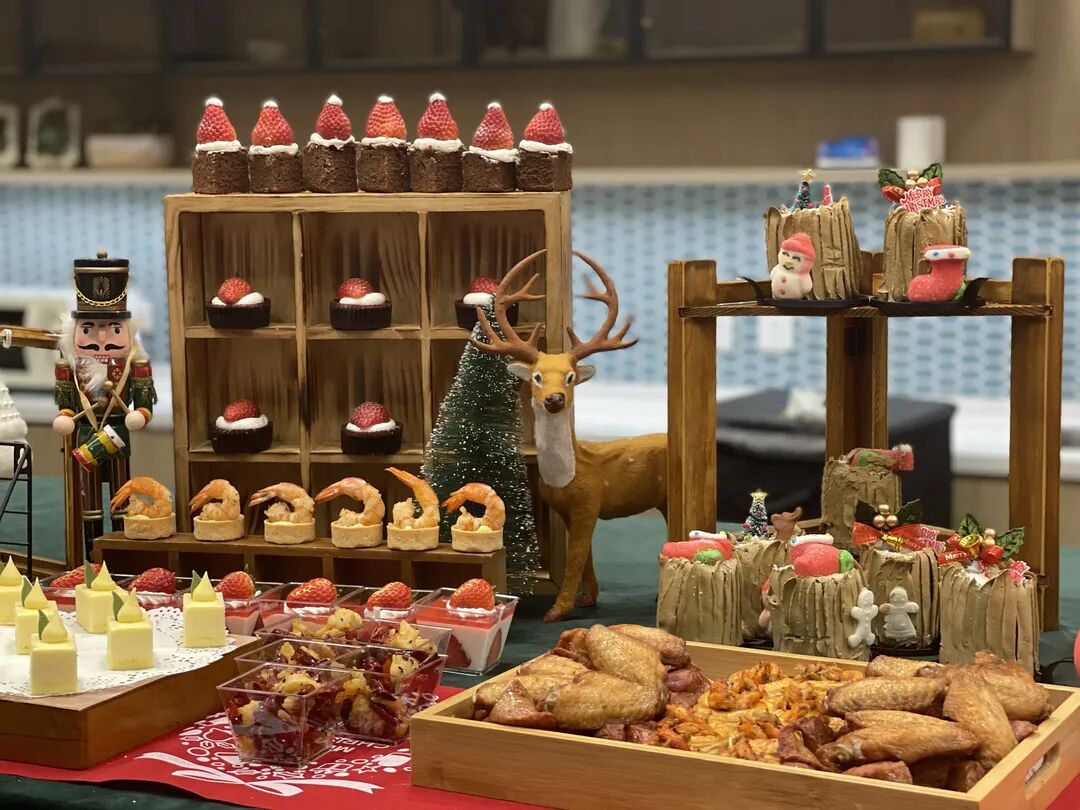 长着麋鹿角的丝绒蛋糕卷、装饰着草莓的金丝笼中小蛋糕、还有打工人最爱的「暴富」杯子蛋糕...而且不仅有甜品,连寿喜锅、奶茶、鸡腿、气泡水也都齐齐备好。