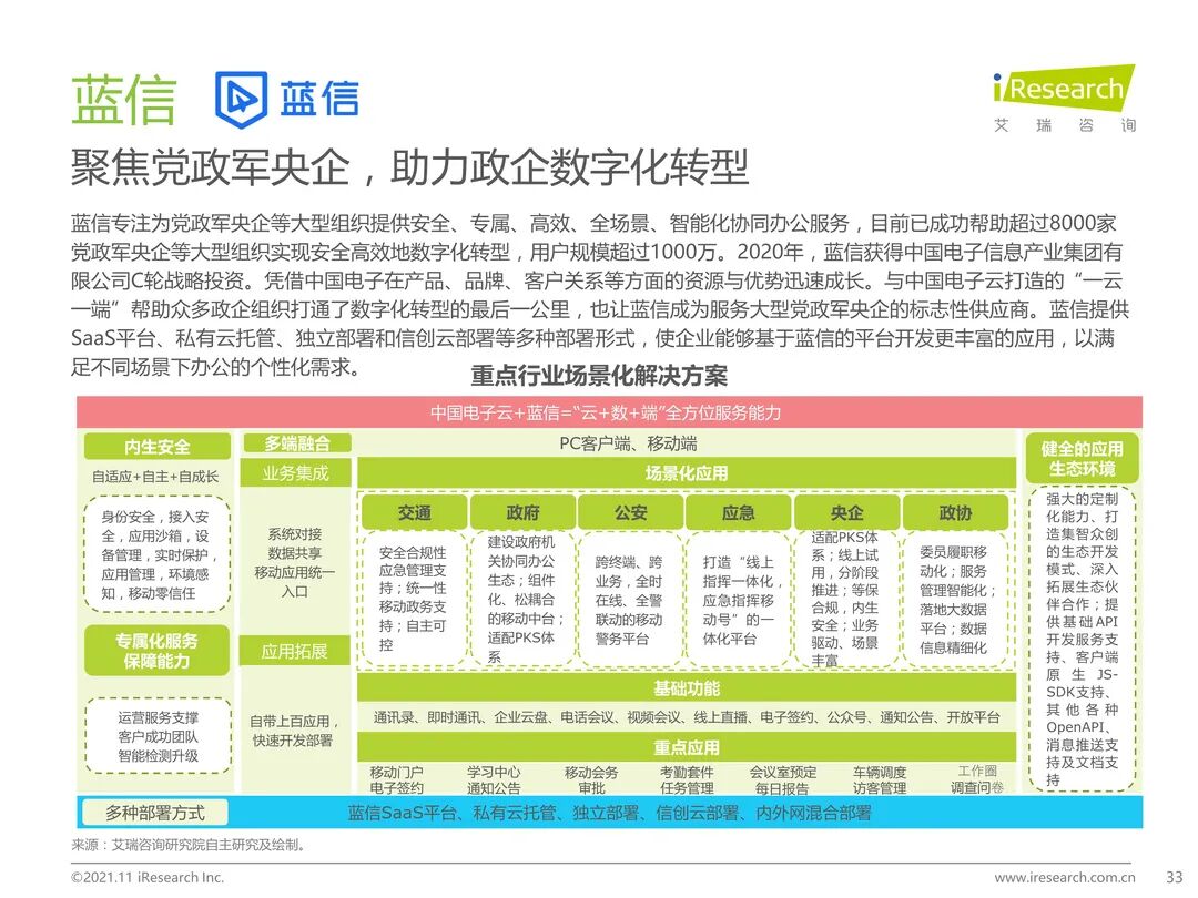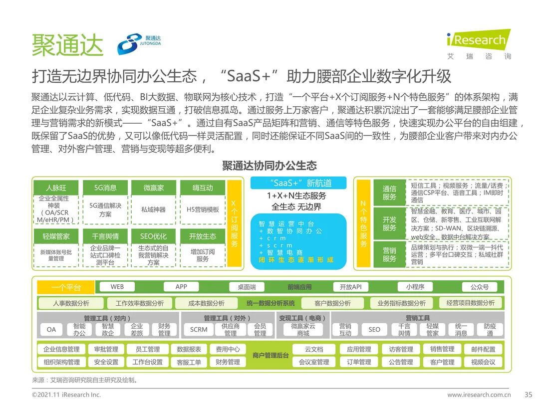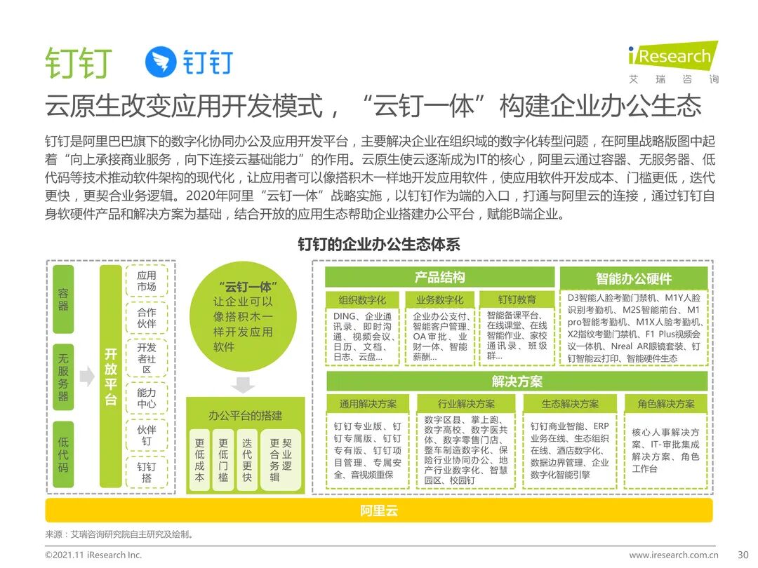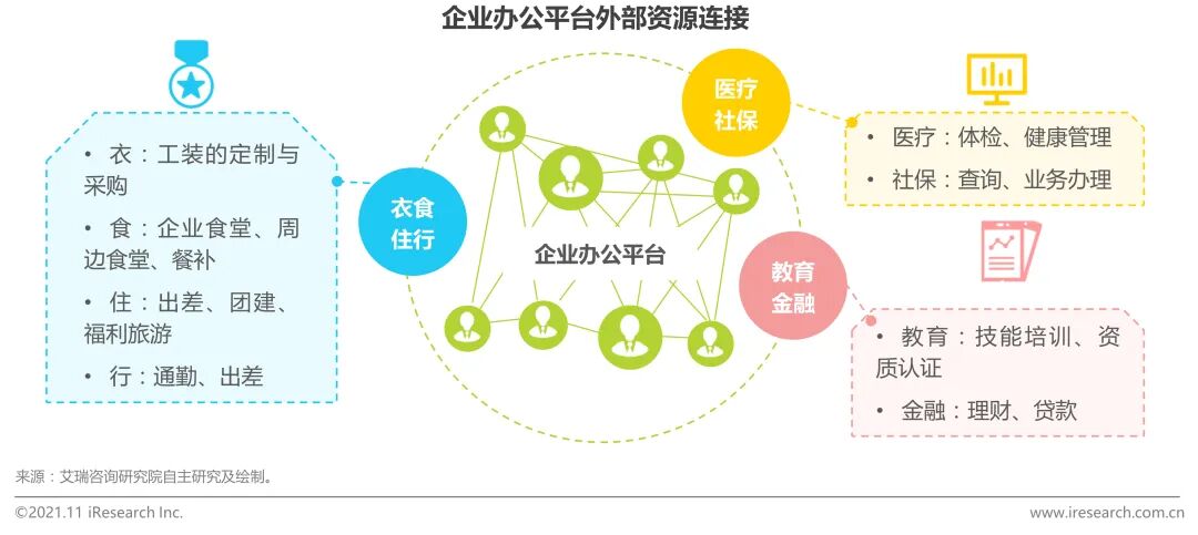 艾瑞《2021年中国综合移动办公平台行业研究报告》各类智能办公平台,除了办公方面的功能之外,还会逐步外接更多的资源,为员工输送更多的产品和服务。
