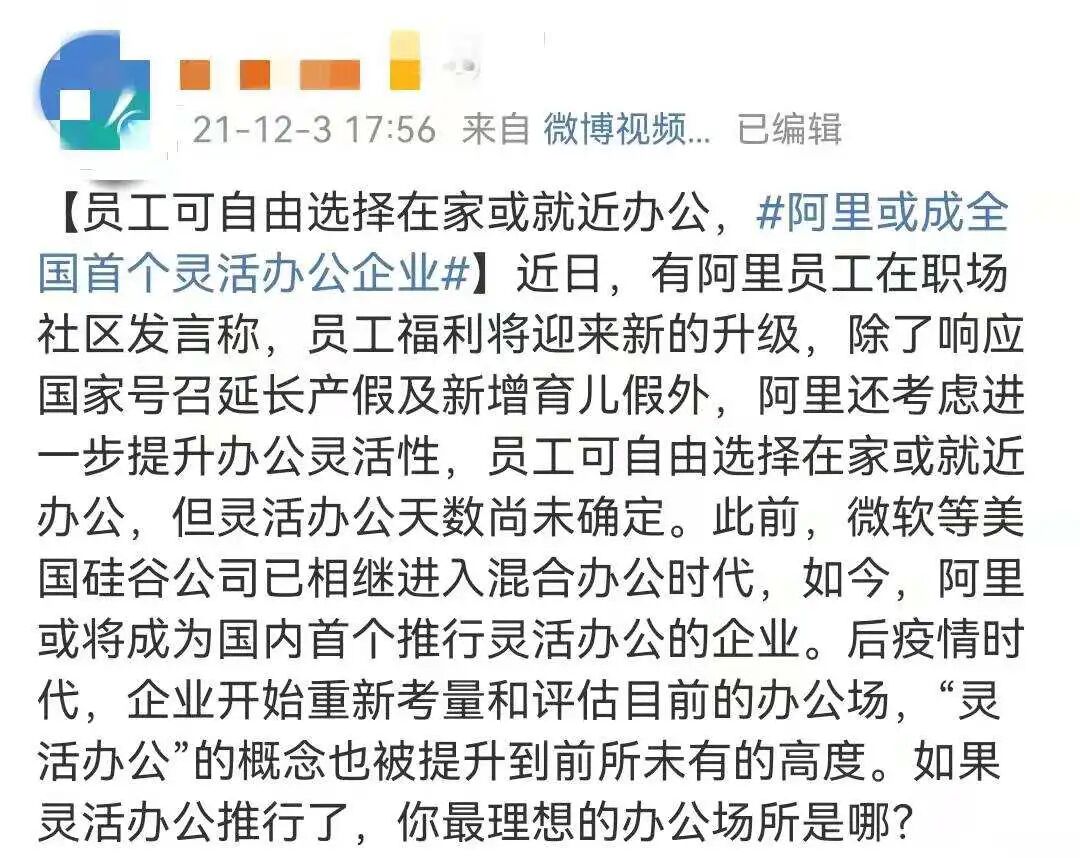 近日,关于#阿里或成全国首个灵活办公企业#的讨论高涨。
