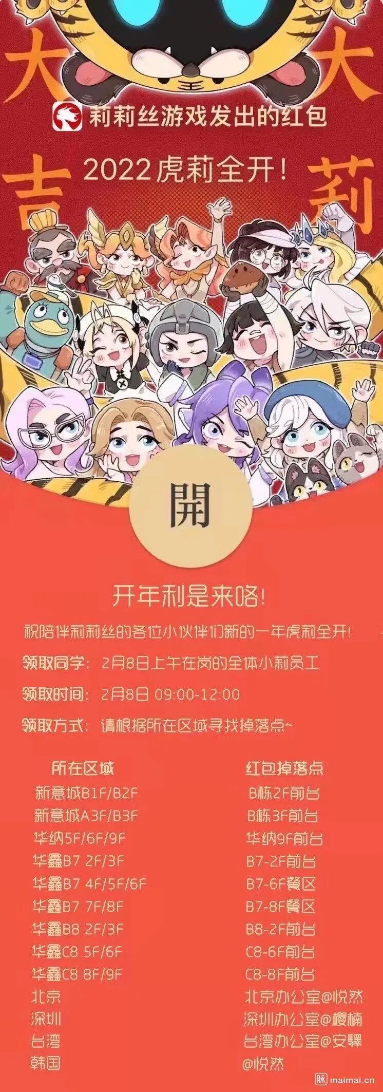 莉莉丝游戏的开工利是包超有创意!需要每个员工根据所在办公区域寻找「红包掉落点」,采用游戏的思维让开工利是变得更有意思更年轻化,让员工更大程度投入其中,2022虎莉全开!