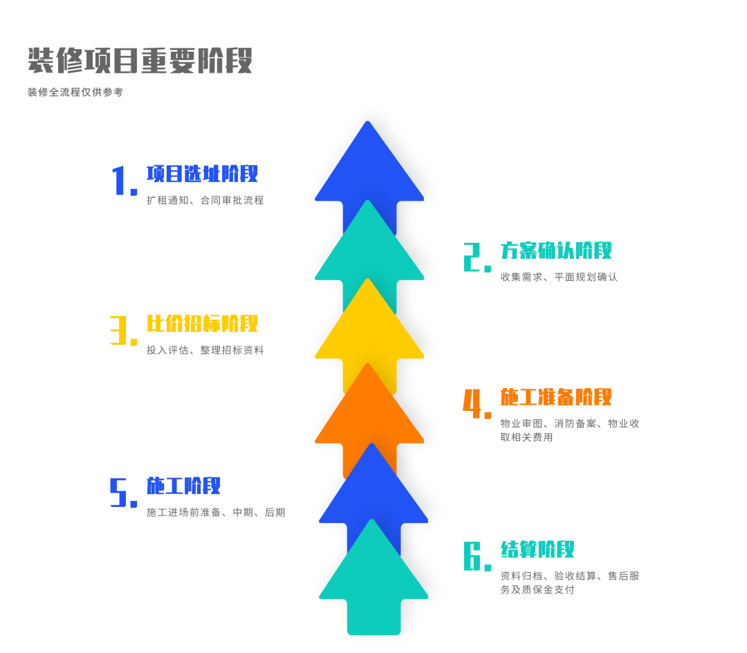 首先,简单概括整体装修项目全流程就是:选址、确认方案、招标、施工以及结算。