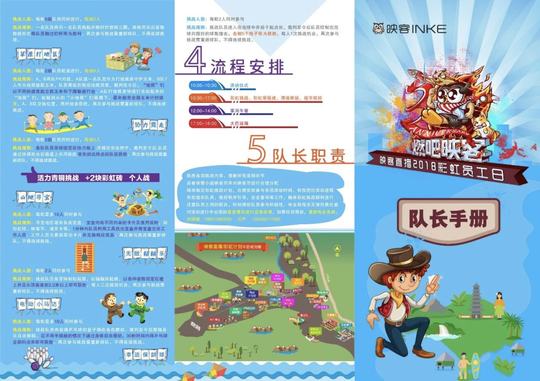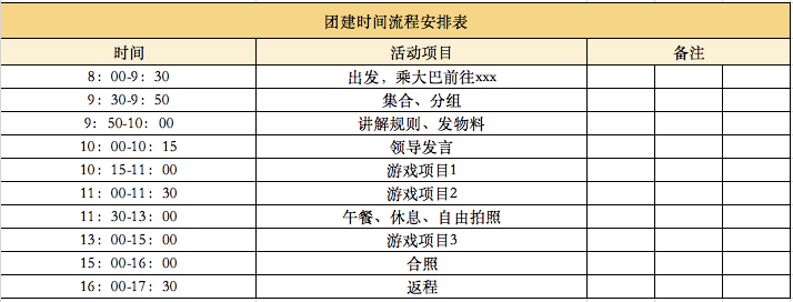 活动流程中的物料筹备主要集中在游戏环节:如果是人数比较少的团建,只需要准备一些小物料,如KT板、手环、纸笔等;如果人数较多、游戏复杂,则可能需要有活动策划供应商提供专业用具、搭建场景;户外拓展活动需要护具的,需要让供应商预备或自行准备。