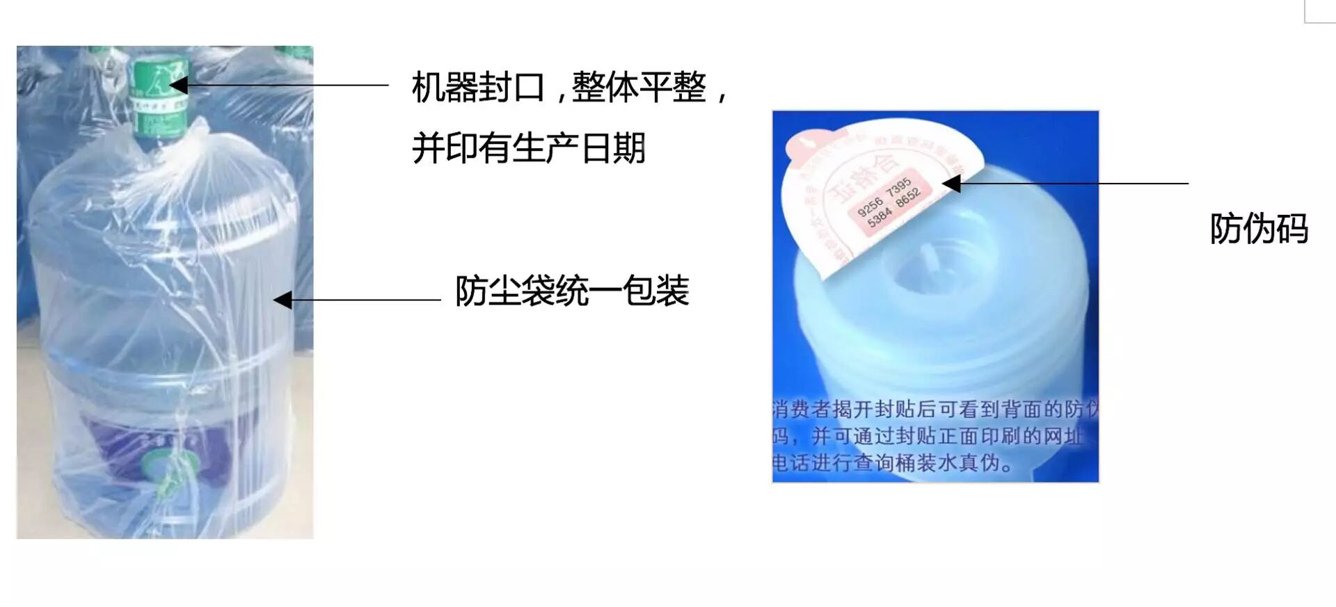 真水水桶盖上都会有防伪标识,形式各不一样,以二维码或一串数字为主,同学们可以扫码或电话核实或网上查询。