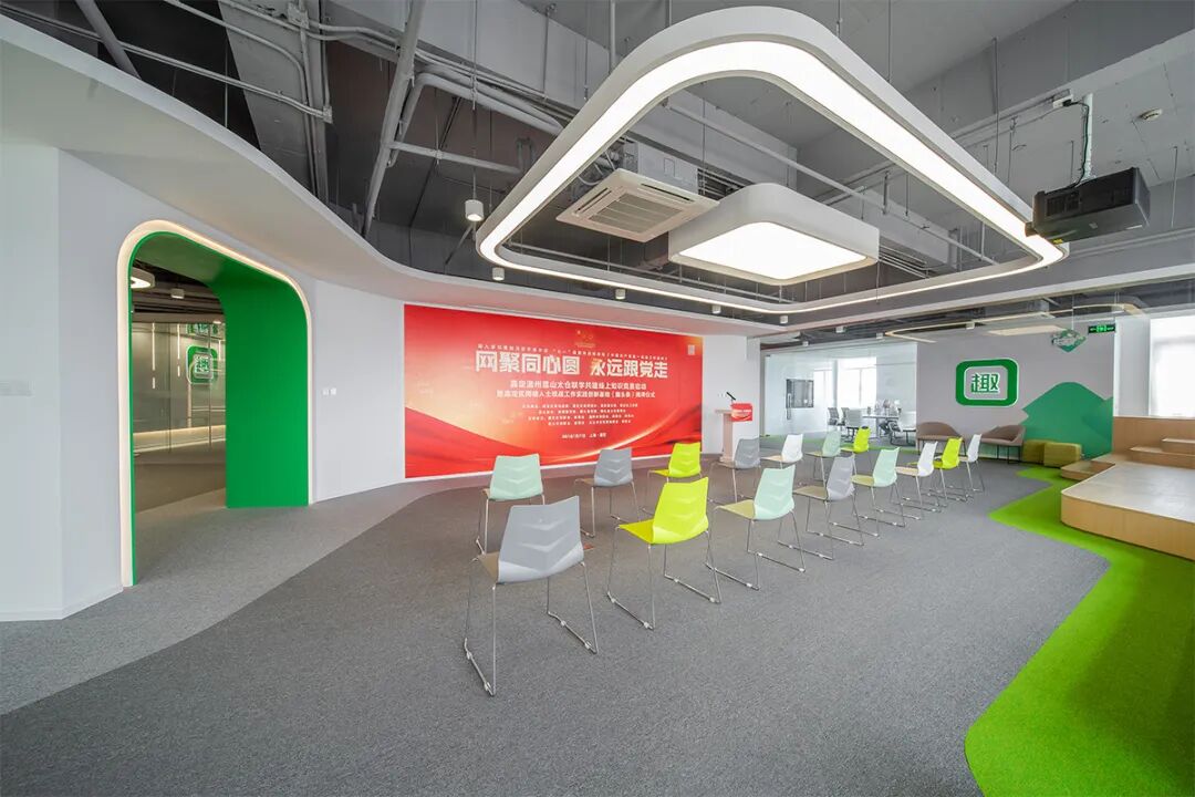 趣头条展厅,右侧的展示区通过企业发展历程、荣誉从而营造一个连续的品牌故事体验,对外树立深刻的品牌印象,与之相对比,左侧搭配科技感产品和技术解决方案的交互式触摸屏,让访客在探索的过程中放慢脚步,让浏览的过程充满互动感。