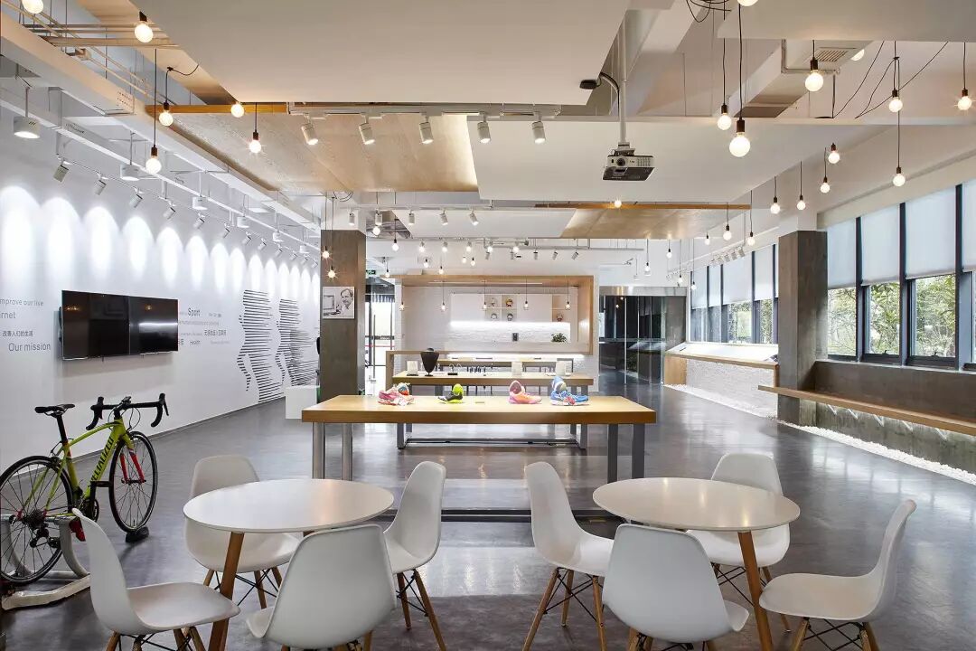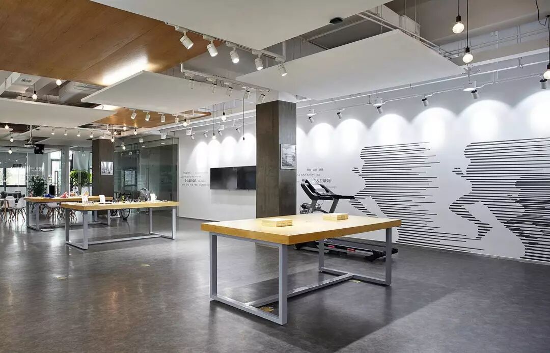华米合肥公司首层的综合展示区集公司介绍、产品展示、体验、咖啡、智能家居、会议及大型演讲等功能为一体,成为了最能展示公司特点的集会场所,空间功能多变,能够充分适应华米人的自由灵活使用,在此上演不同的情景办公模式。