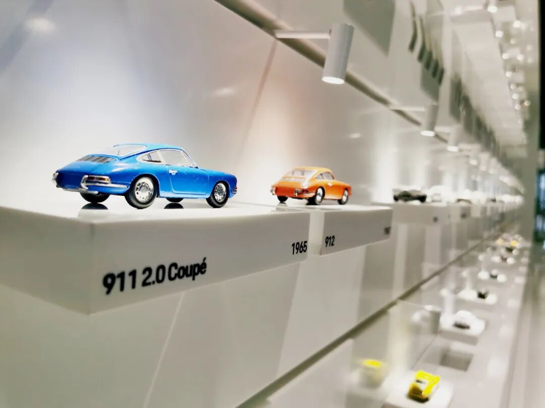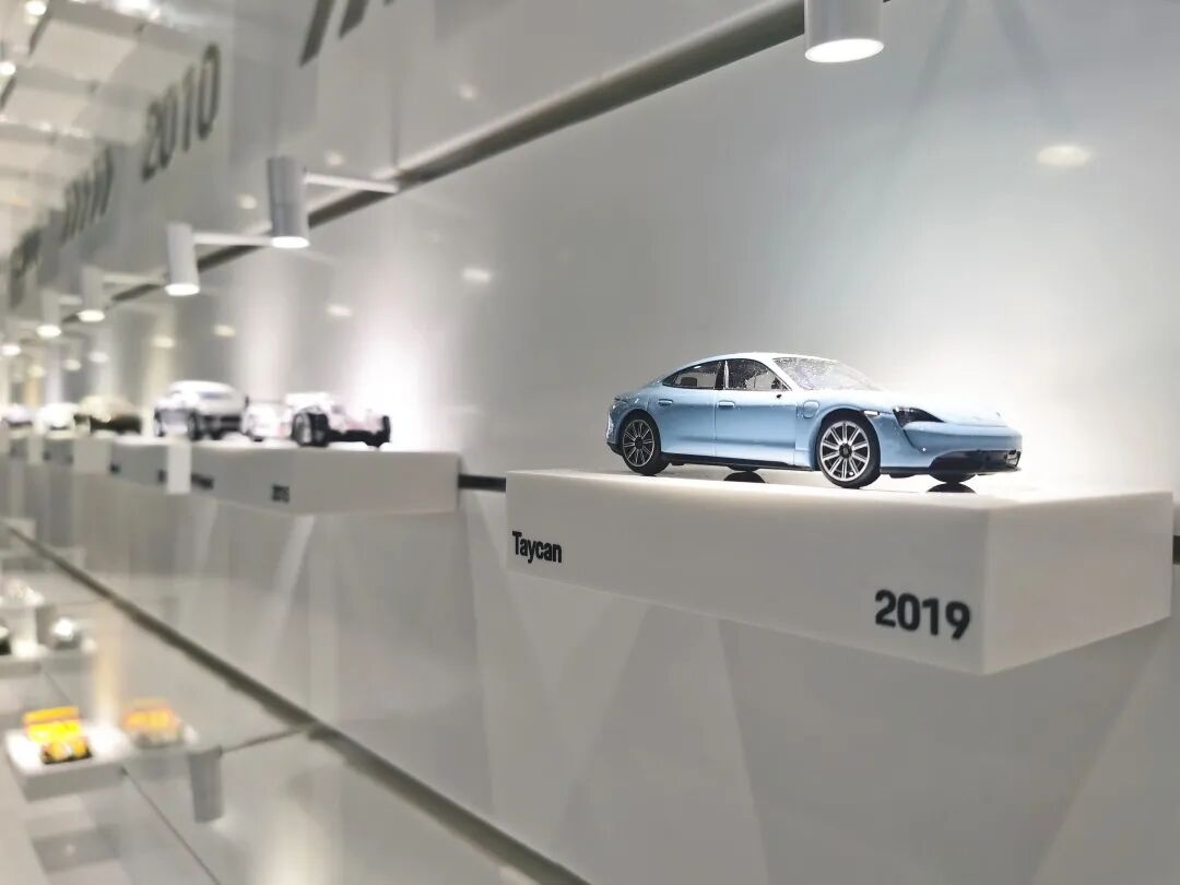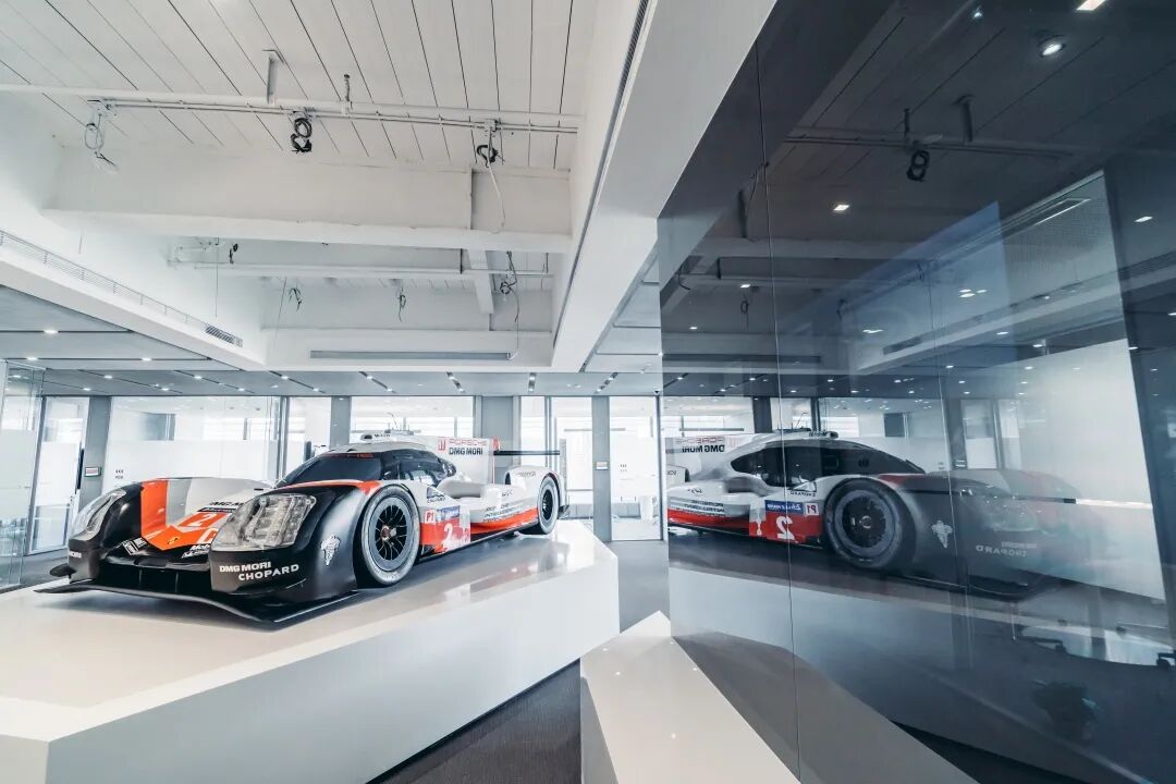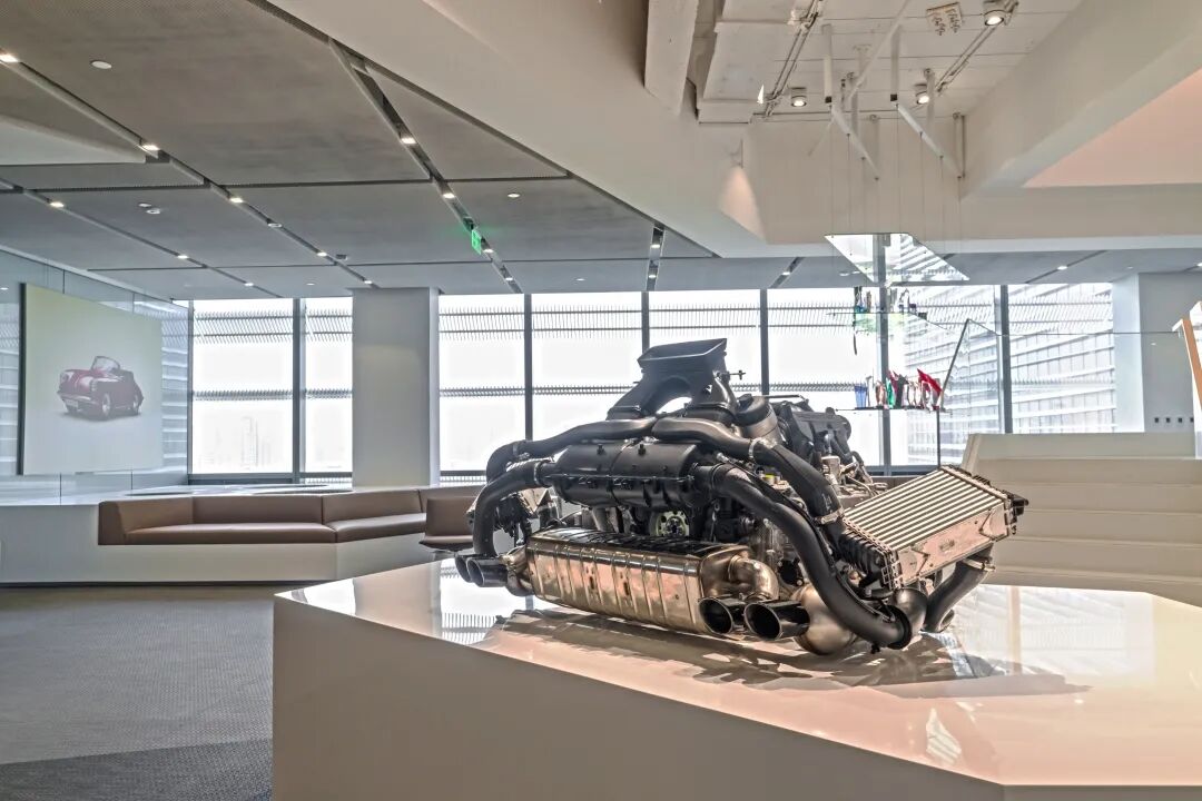 保时捷公司内部设有不同的汽车展示区:1楼入口处的两个展位,每月更换极具纪念意义的汽车;13楼有常驻展示区域,展有919 LMP 1模型、发动机等;还有一面象征着保时捷产品发展历史的车模墙。