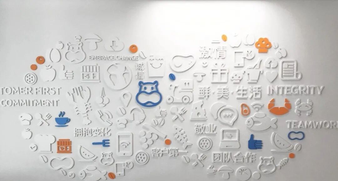 盒马的文化墙把IP盒马造型发挥到极致,即是文化墙也是一面艺术墙,简直达到了人见人爱的程度!彩色的盒马x地标插画墙、盒马表情包简笔画墙、还有用业务相关元素和价值观组合起来的标语文化墙... 用实力做到了让你因为一面文化墙而爱上一家企业。