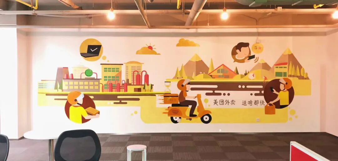 美团外卖把公司业务流程结合插画绘在墙上,时刻向员工展示他们的工作意义——让生活更便捷更美好。