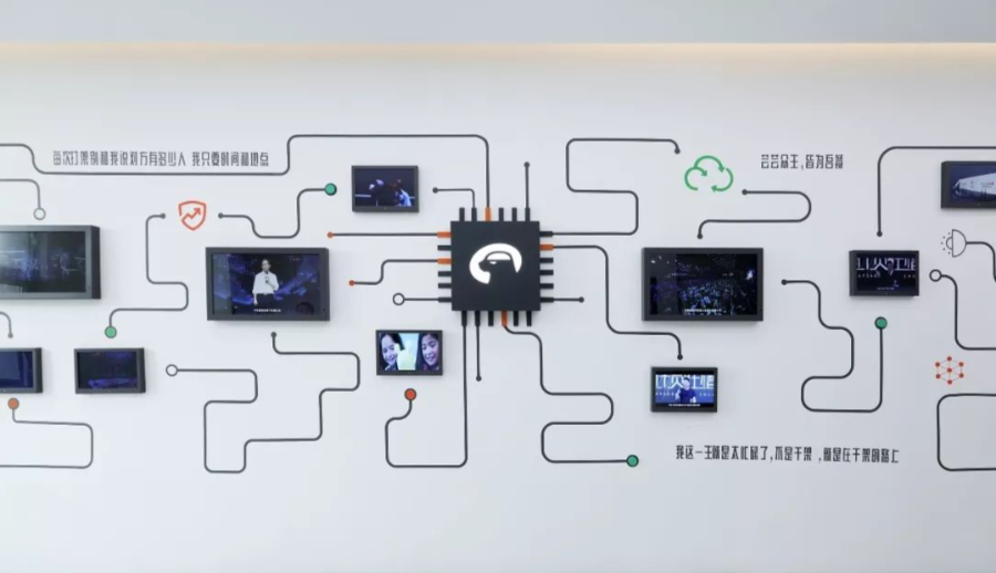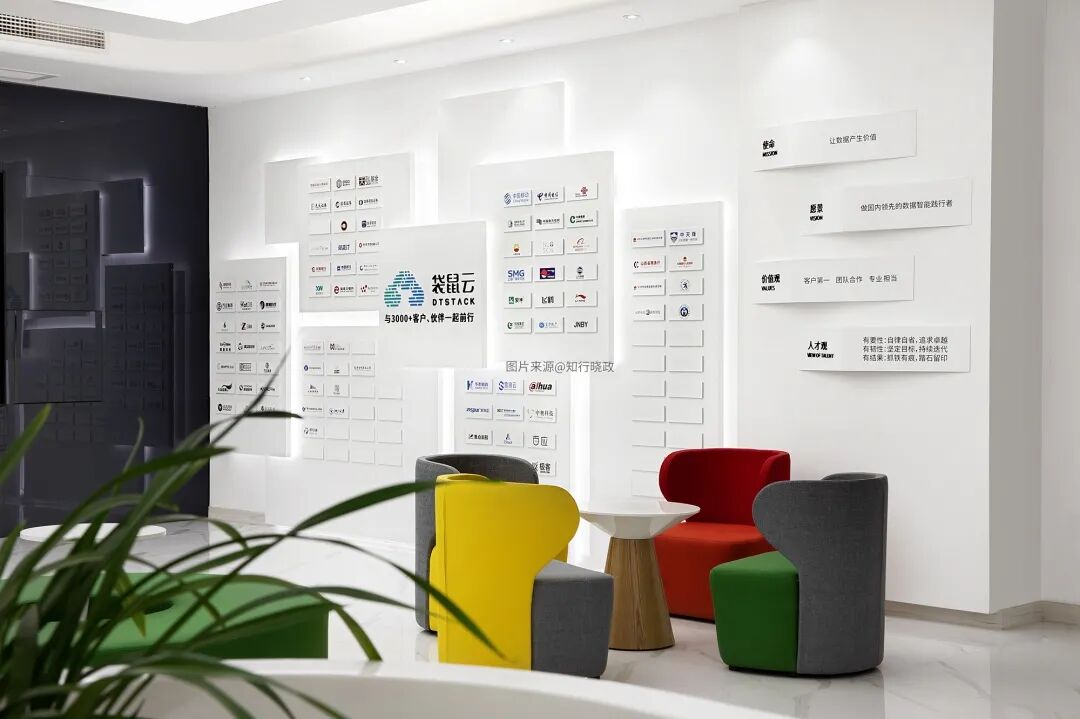 可以像袋鼠云这样将不同大小的长方形板块组合起来,像电脑上打开的多个网页一样,丰富内容一览无余,整洁不杂乱。配合上灯带装饰,还能让文化墙更加立体有层次。