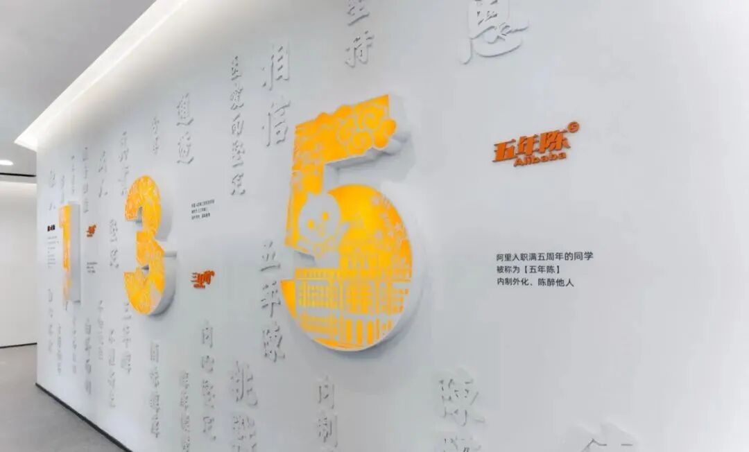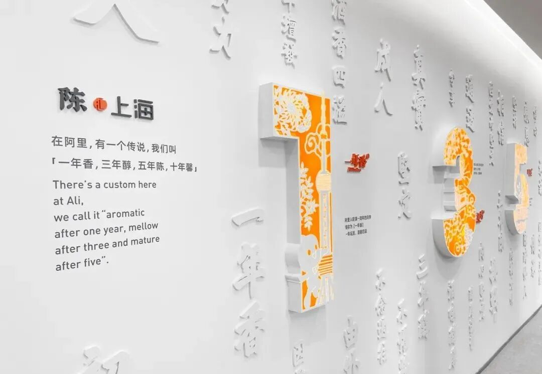 线条也可以是对企业来说意义非凡的数字,阿里巴巴也把对他们来说很特别的“1”年香、“3”年醇、“5”年陈写在了上海中心办公空间的墙上。