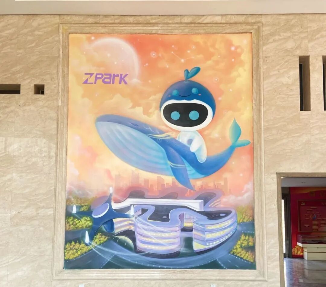 中关村作为一个科技园区,如何展现自己的文化呢?他们把园区的吉祥物和标志性建筑画在公共服务中心大堂,一座巨大的蓝鲸承上启下,象征着中关村是科技领域的领头鲸。