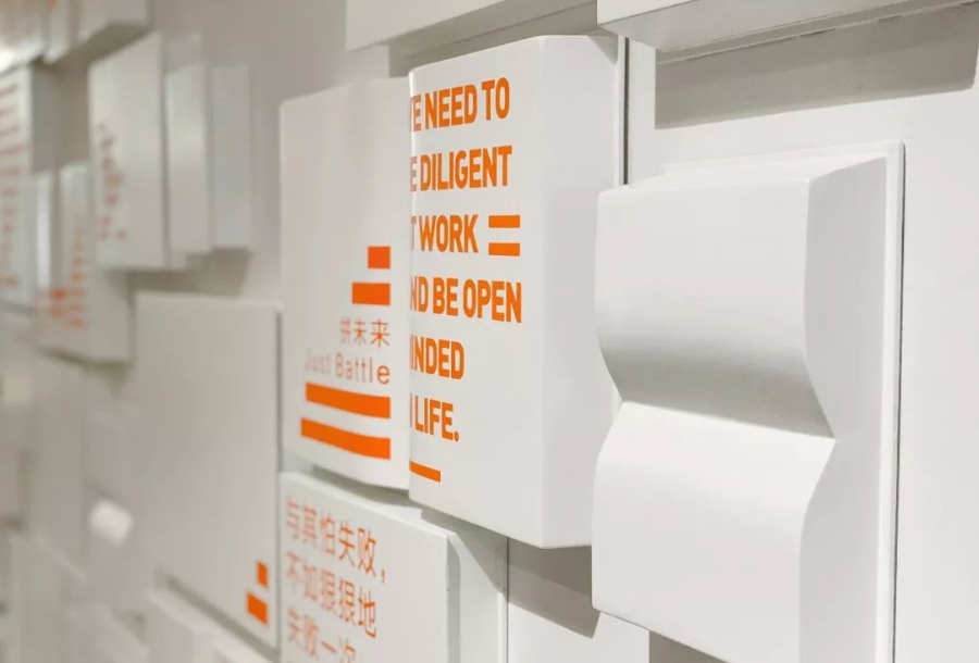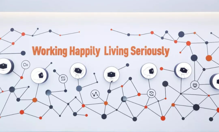 平头哥用各种线条和几何形状表达他们的态度。文化墙上的每一个圆点代表一个员工,员工连接起来就是一家公司,而中间“working happily living seriously”的大字,就是企业和员工共同的价值观。
