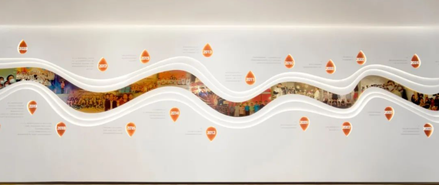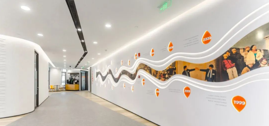 阿里巴巴上海中心的文化墙是一条沿着走廊流动的长河。企业发展的每个重要时期都是一颗水滴,汇聚成企业的浪潮翻涌前进。