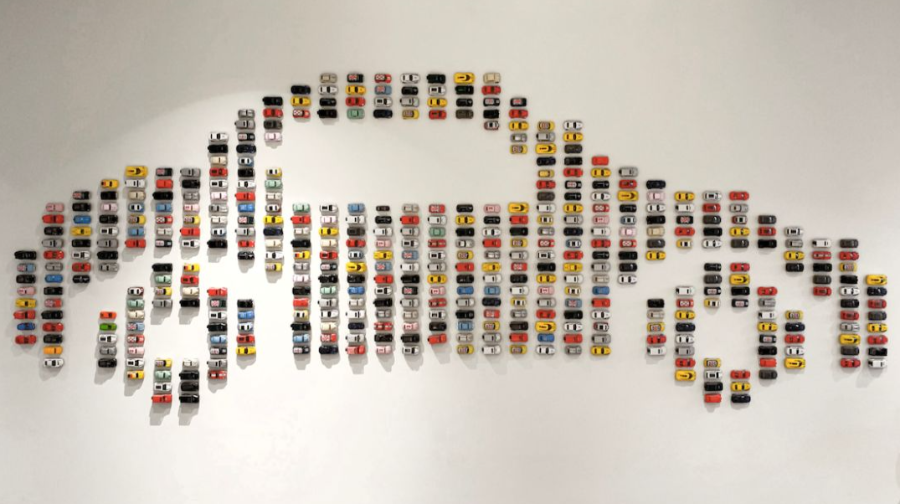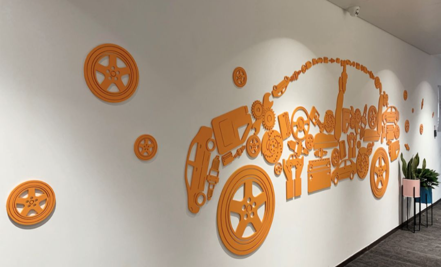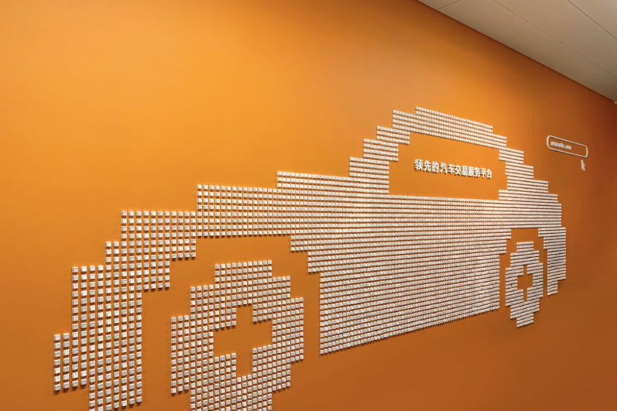 人人车的文化墙则是各种汽车造型。由键帽拼成的小汽车展现他们的互联网属性;
