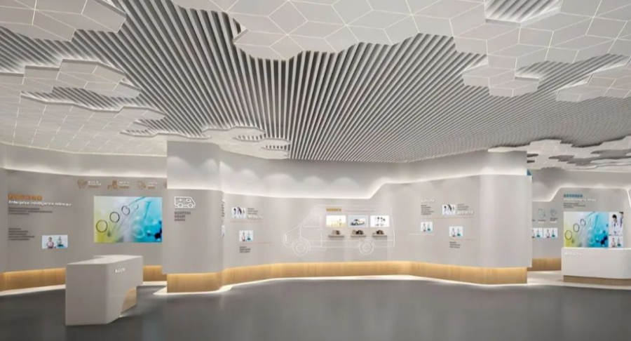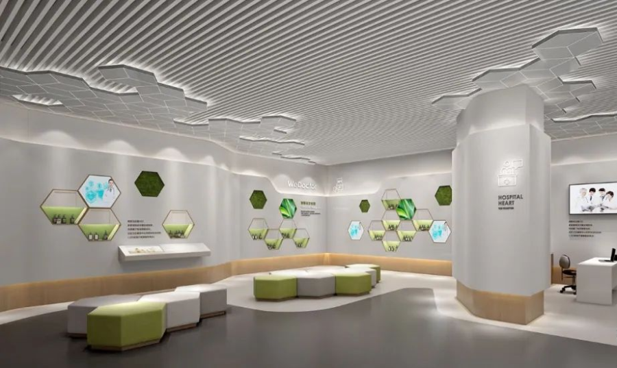 选择多边形几何图案让文化墙更亮眼。微医集团将文化墙的六边形元素也应用在天花板上,相互呼应,营造微医文化氛围、讲述微医故事、展示微医风采。