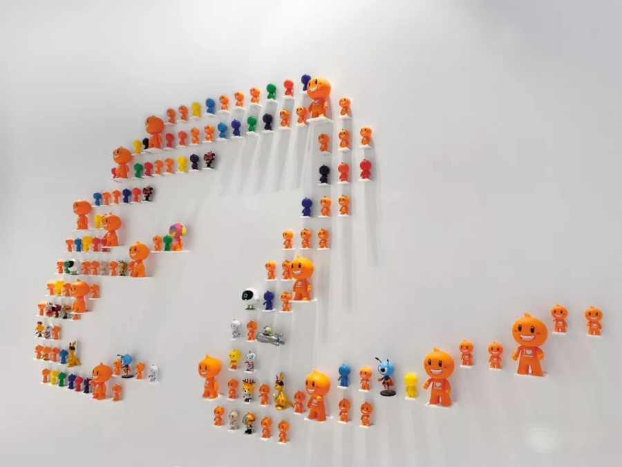 不同颜色造型和大小的淘公仔组成的logo墙↓