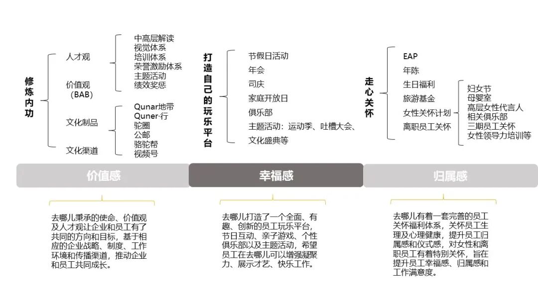 通过物质层的工作巩固及落地行为层目标,是你建立具体文化体系的基础。比如我们写过的去哪儿的EHP体系文化活动案例,他们就是先明确了价值感、幸福感、归属感这三大行为关键词,然后围绕它们提出打造平台、提供走心关怀等一系列操作。